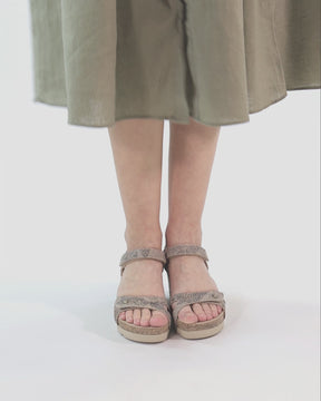 Wedge sandals. Natural nappa leather. Velcro Closure. Leather lining. Anatomical insole. Lightweight, flexible, strong cork and EVA rubber sole. Heel height: 6.5 cm. 100% Made in Spain.