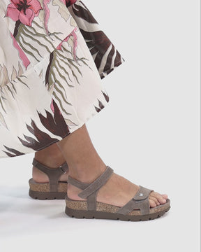 Flat woman's sandals. Suede in pebble-grey. Velcro Closure. Leather lining. Anatomical insole. Lightweight, flexible, strong cork and EVA rubber sole. Heel height: 4.5 cm. 100% Made in Spain.